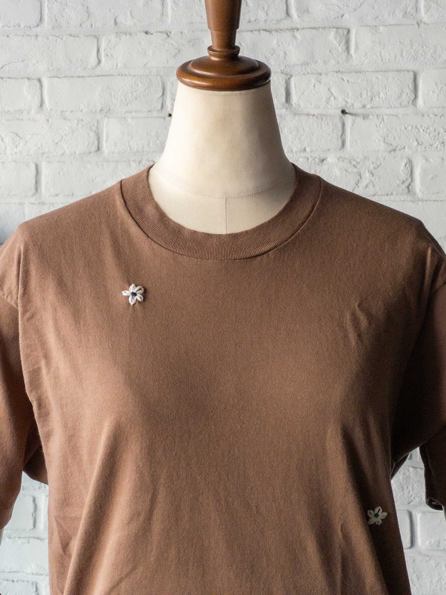 ヴィンテージのミリタリーTシャツに、ひとつひとつ小花の手刺繍が散りばめられています。