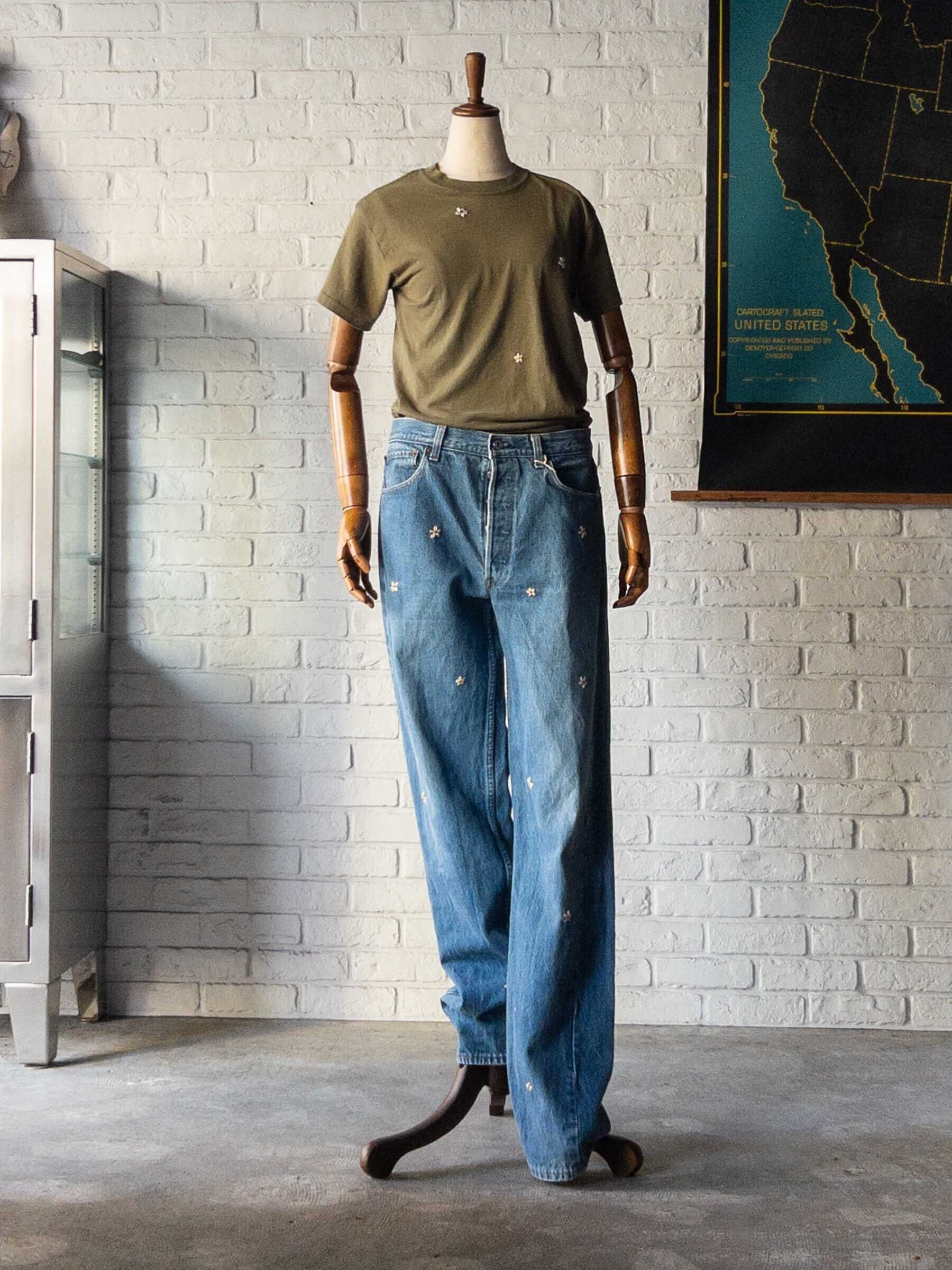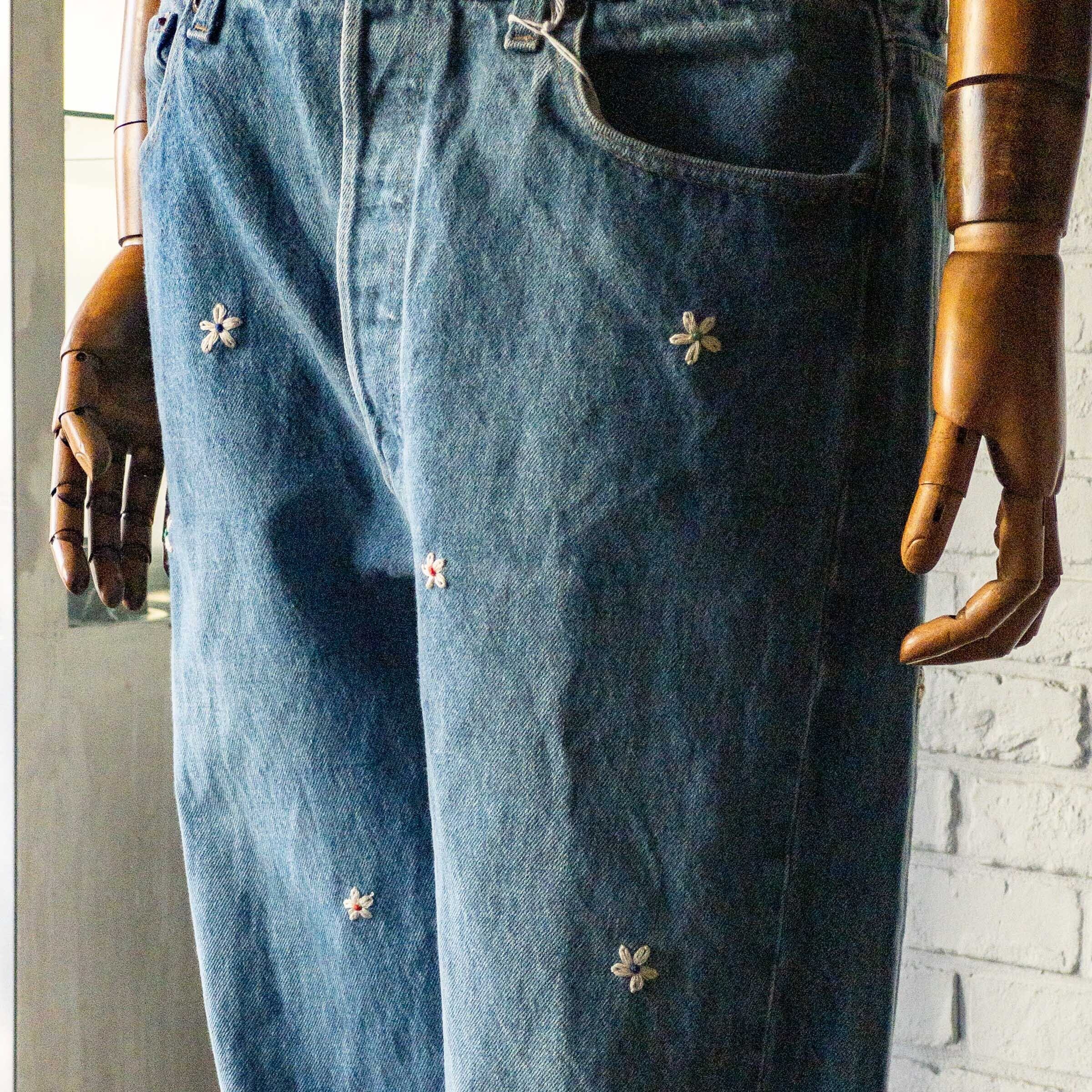 稀少な90年代ヴィンテージのUSA製 LEVI'S JEANSに、ひとつひとつ小花の手刺繍が散りばめられています。