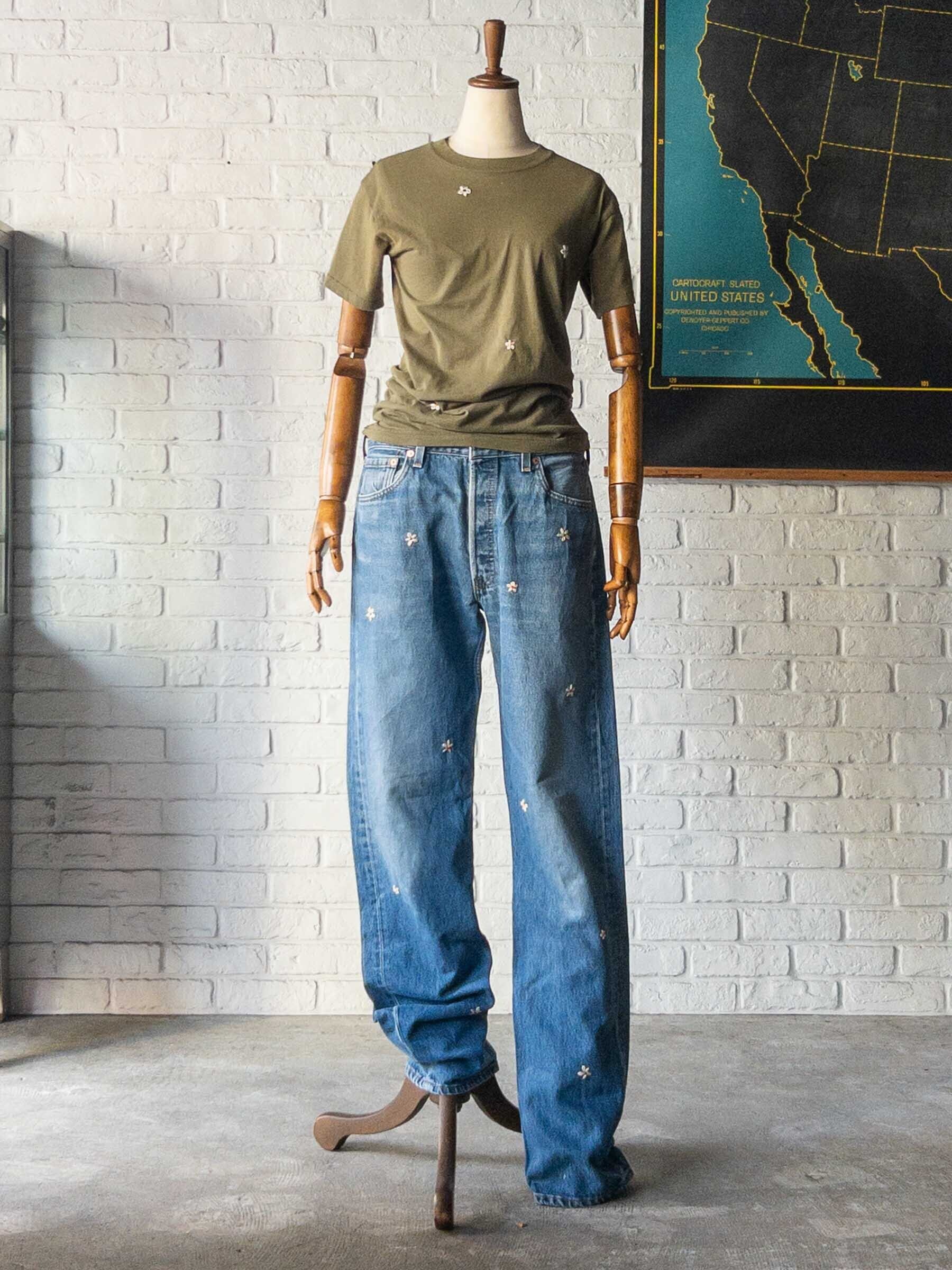 稀少な90年代ヴィンテージのUSA製 LEVI'S JEANSに、ひとつひとつ小花の手刺繍が散りばめられています。