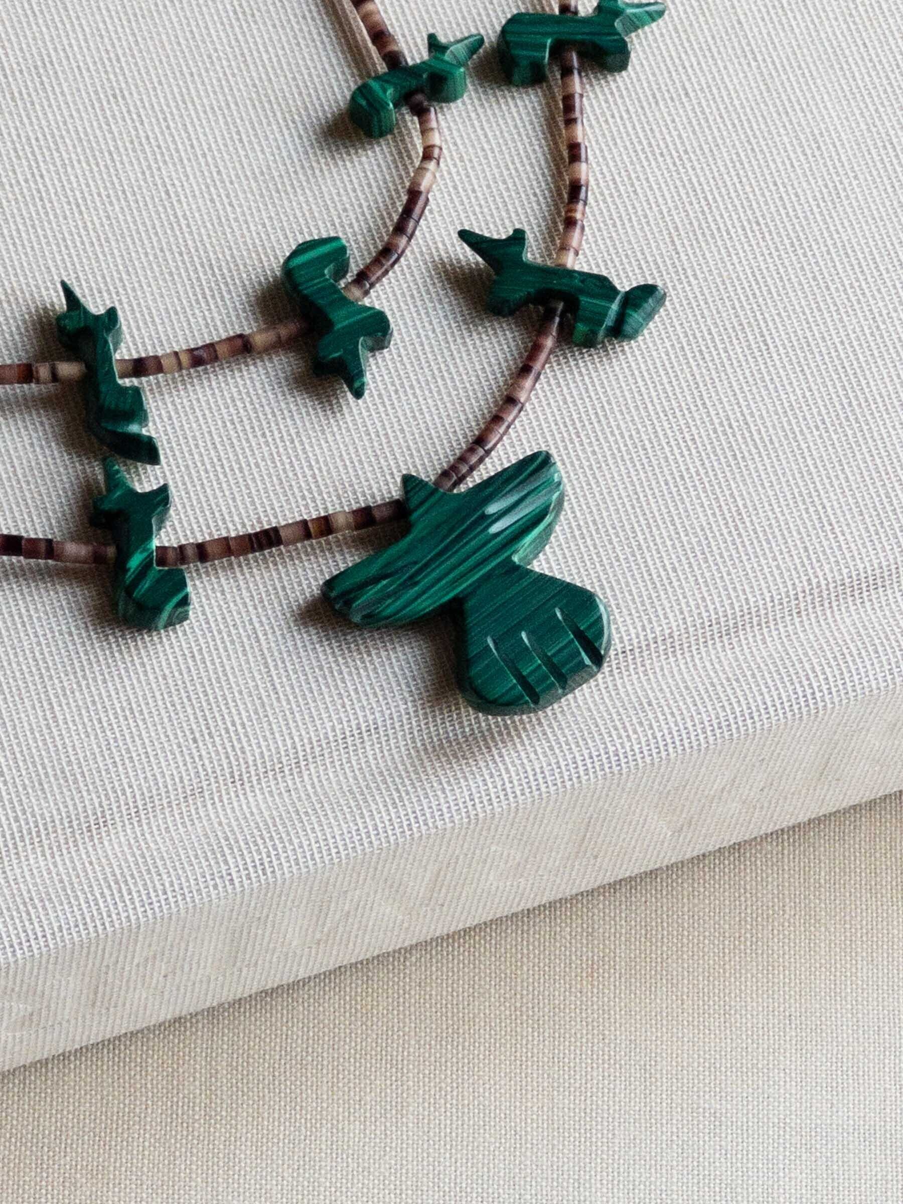 こちらは深緑色が珍しい、マラカイト(孔雀石)から切り出された動物たちが連なるネックレスです。