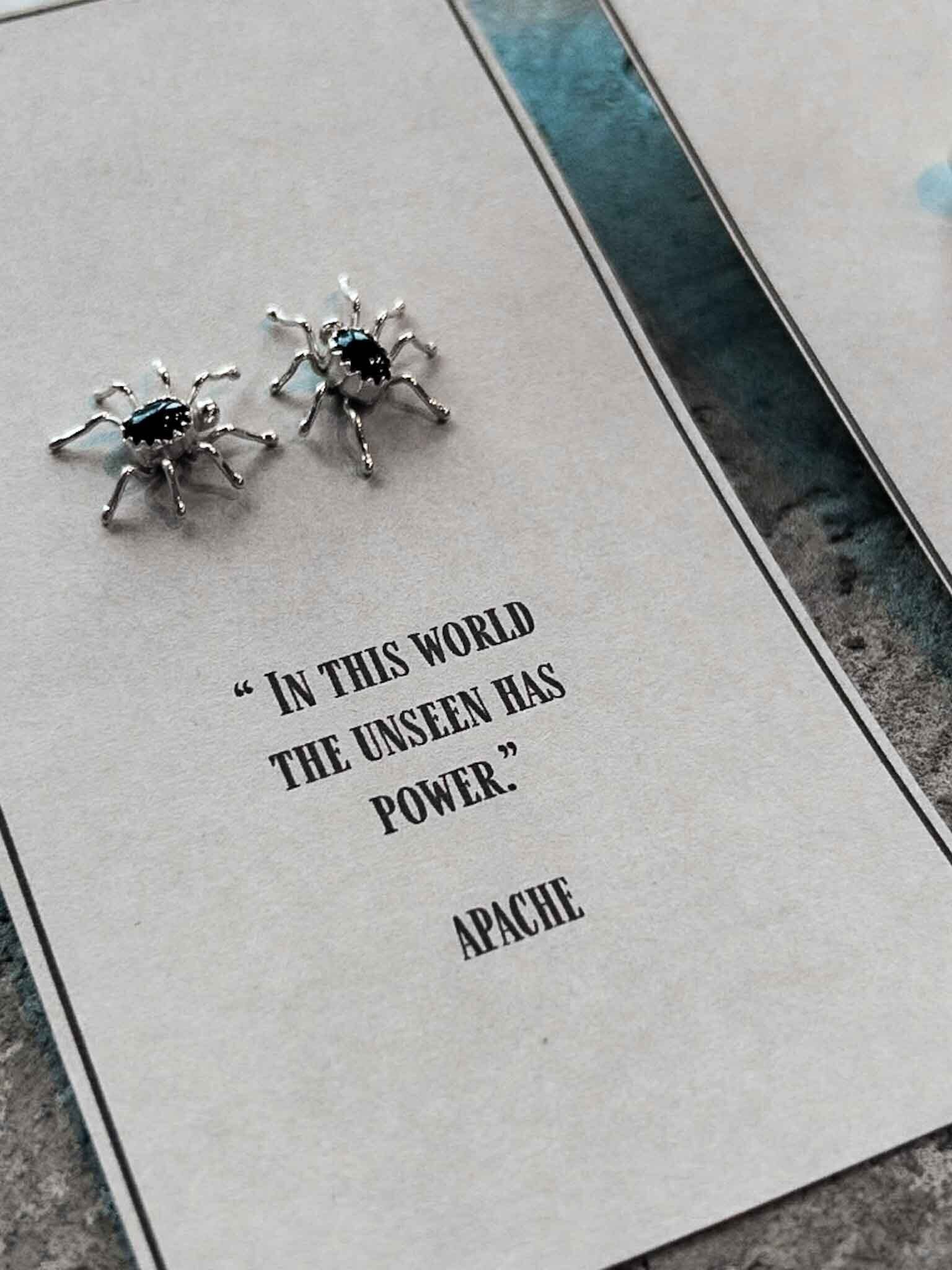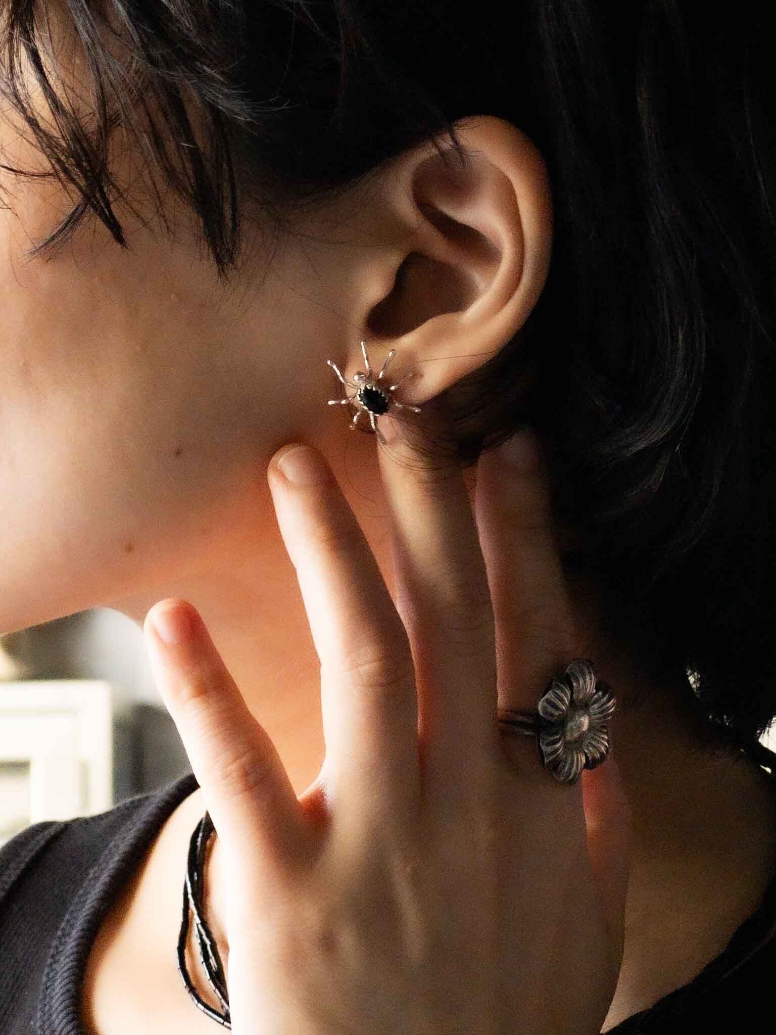 ナバホ族のシルバーワークによる、ちょっとリアルな蜘蛛を模ったピアス。