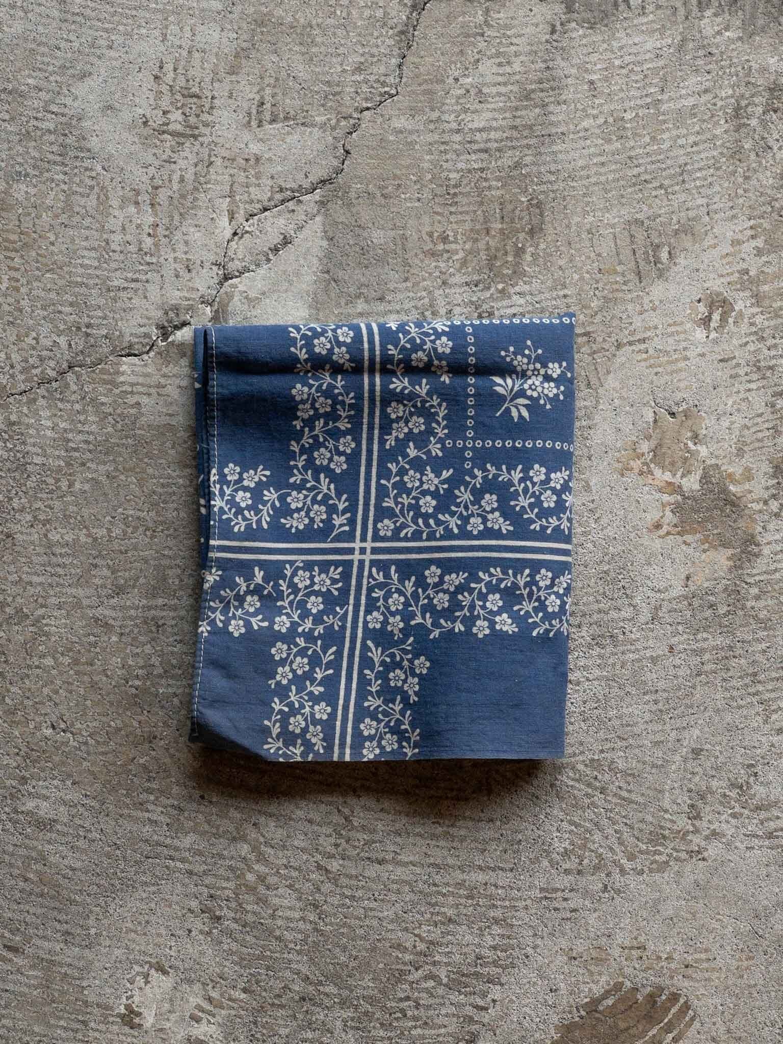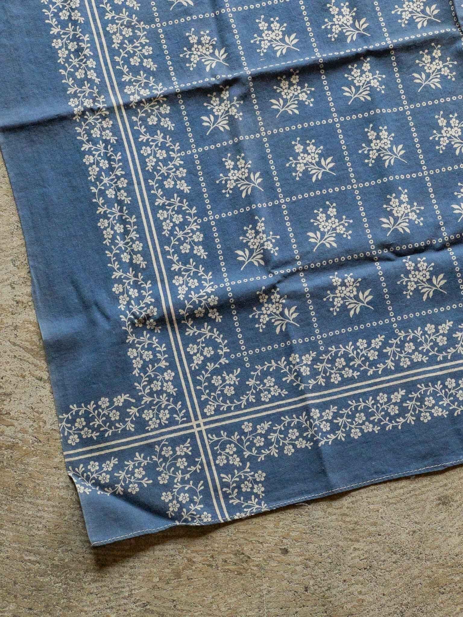 フェイドしたようなブルーに可愛らしい小花の柄が美しく、スカーフのように頭に巻いていただくのもおすすめです。